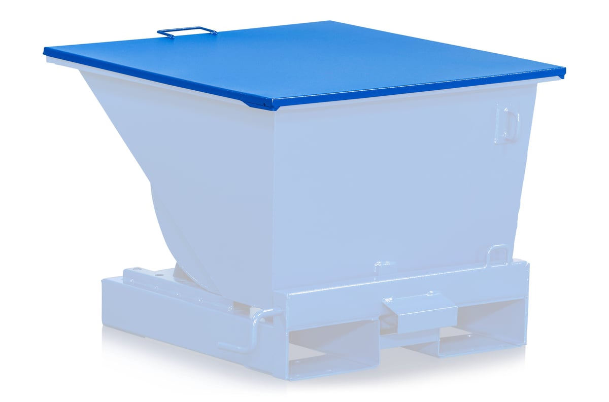 Fladt låg til standard vippecontainer, 600 l. Fremstillet af 1,5 mm stålplade og pulverlakeret i blå RAL 5005. Bemærk: Kun låget medfølger, ikke selve vippecontaineren.
