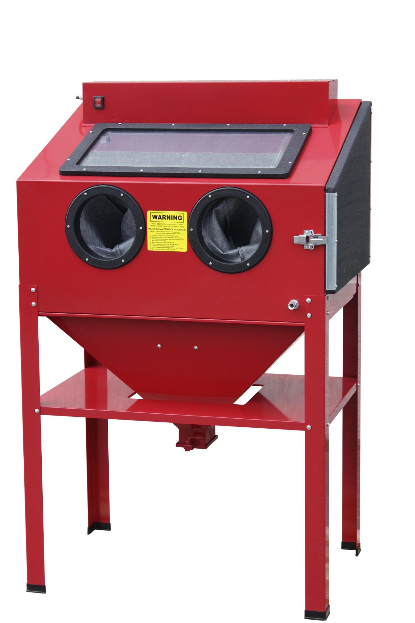 Sandblæsekabine med låge i siden. Denne gulvmodel er især velegnet til større emner, der føres ind gennem dørene i siden på kabinen. Emnerne placeres på den indbyggede rist.