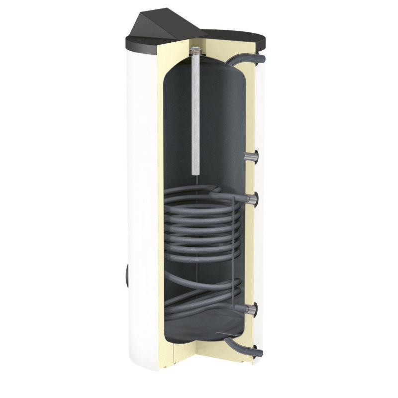 Flamco DUO HLS 400L varmtvandsbeholder med 100 mm hvid isolering. Ideel til fjernvarme og varmepumper, men kan også anvendes til olie, gas og fastbrændsel.