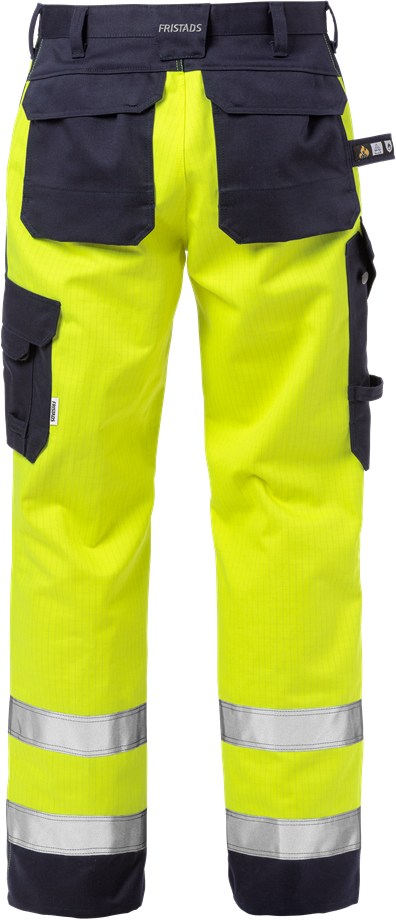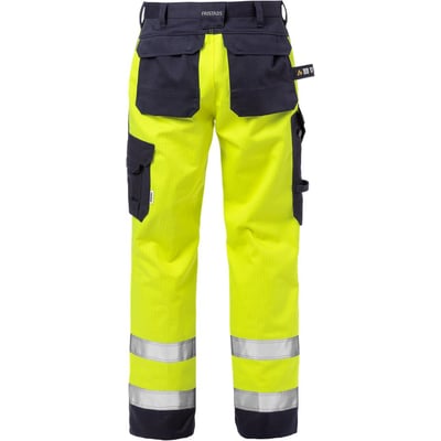 Flame HiVis bukser med CORDURA-forstærkede lommer, dobbeltforstærket skridtsøm og Aramid-forstærkede lårpaneler. Godkendt til industrivask og OEKO-TEX-certificeret.