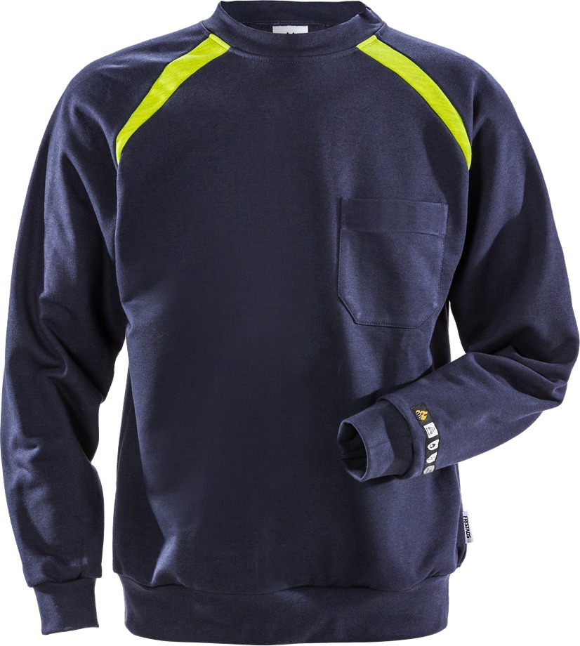 Denne sweatshirt er designet med fokus på sikkerhed og komfort. Den har et elastisk bånd ved halsen, håndleddene og forneden, hvilket sikrer en god pasform og bevægelsesfrihed.