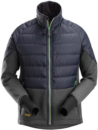 Multifunktionel Snickers Workwear FlexiWork hybridjakke i smidigt, fugttransporterende jerseystof med Repreve® isolering. Elastisk design for optimal bevægelsesfrihed og varme.
