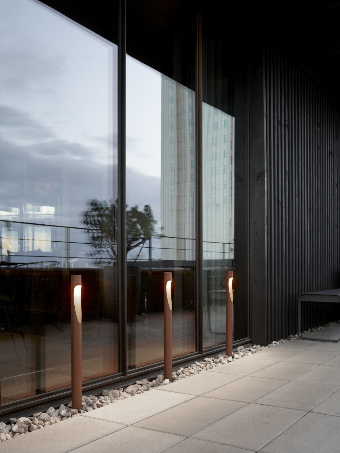 Flindt Garden pullerten, designet af Christian Flindt, oplyser udendørsområder med en enkel og elegant æstetik, hvilket gør dem mere tilgængelige efter mørkets frembrud.