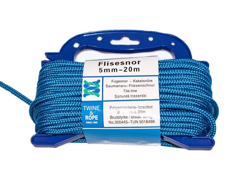 Blå flisesnor med hjerteform, 5 mm i diameter og 20 meter lang. Ideel til alle dine fliseopgaver.