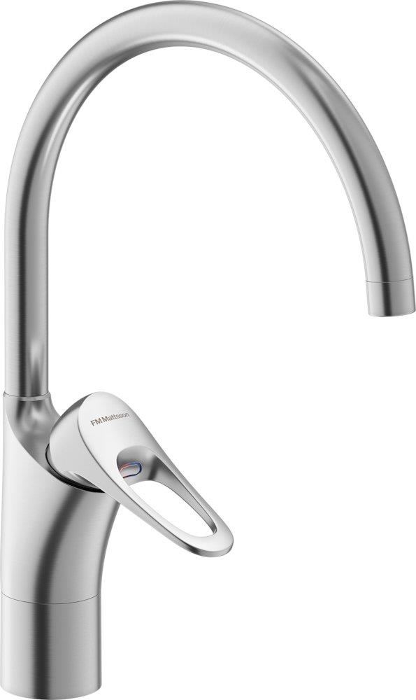 Dette køkkenarmatur fra FMM er designet med en praktisk C-tud og en elegant børstet krom-finish. Armaturet er udstyret med koldstart funktion, som reducerer unødvendigt varmtvandsforbrug og dermed sparer energi.