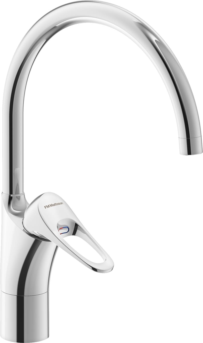 FMM 9000XE køkkenarmatur med C-tud i krom. Vandbesparende (6 l/m) og koldstart. Keramisk lukning og skoldningssikring.