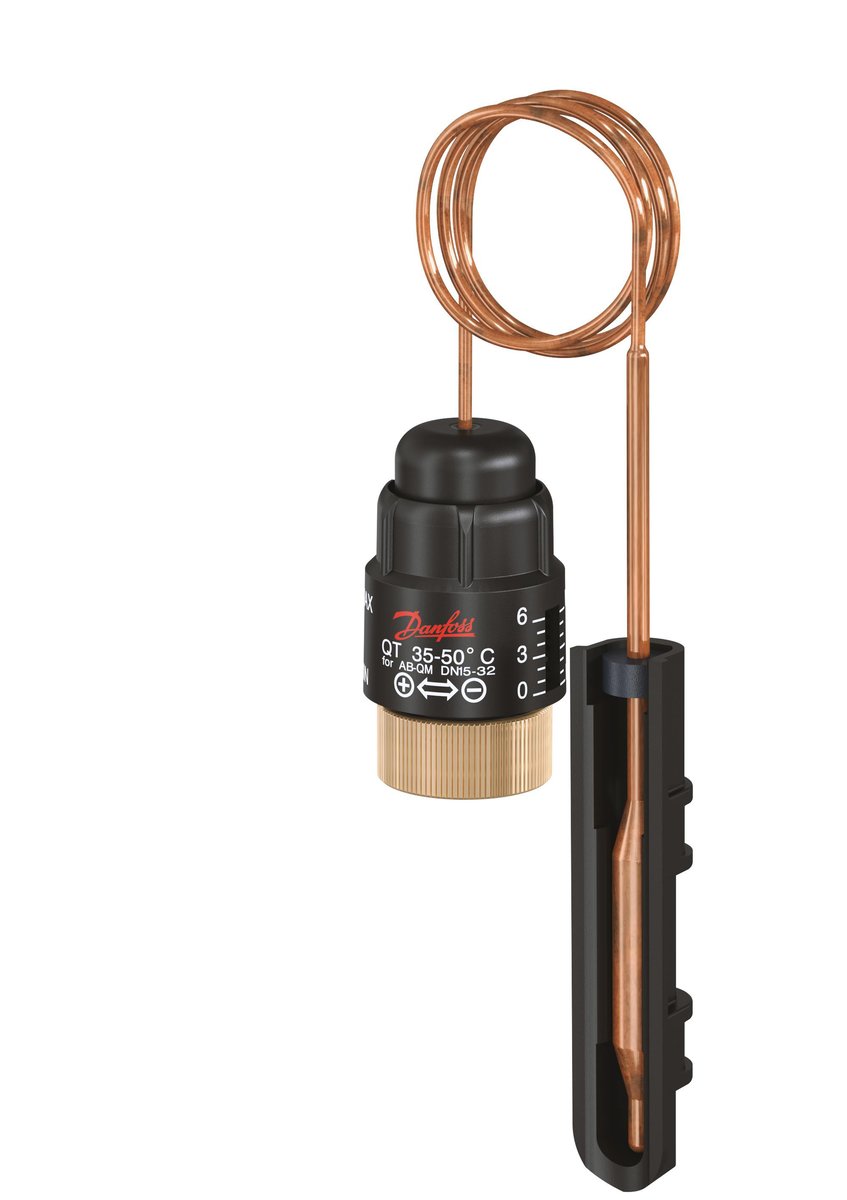 Danfoss QT er en termostatstyret aktuator til returtemperaturregulering i 1-strengs varmeanlæg. Bruges med AB-QM 4.0 ventilen for en komplet løsning.