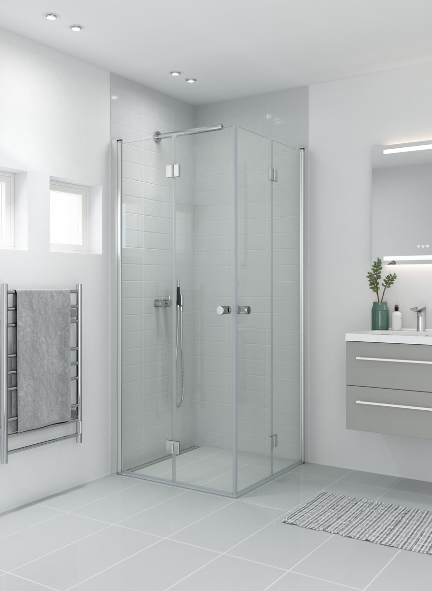Match B bruseafskærmning med foldedør i klart glas og satinprofil. Nem rengøring med EasyCare.
