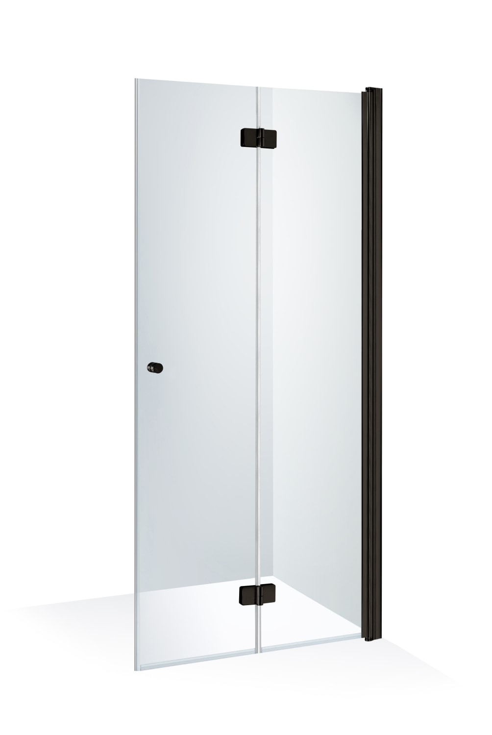 Simona foldedør med klart glas og sorte profiler, designet til højrehåndsmontering. Måler 90x200 cm og har 6 mm glastykkelse.