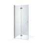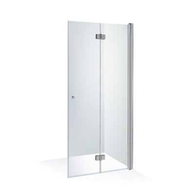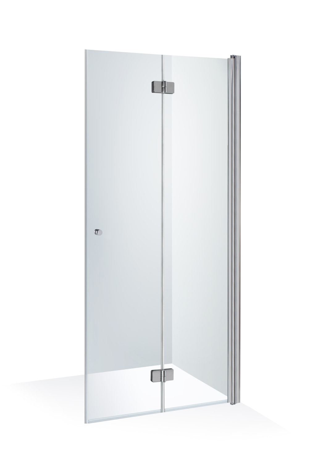 Simona 1/2 foldedør med klart 6 mm glas og elegante kromprofiler. Designet til højrevendt montering, måler 90x200 cm og har en justerbar profil på 1,3 cm.