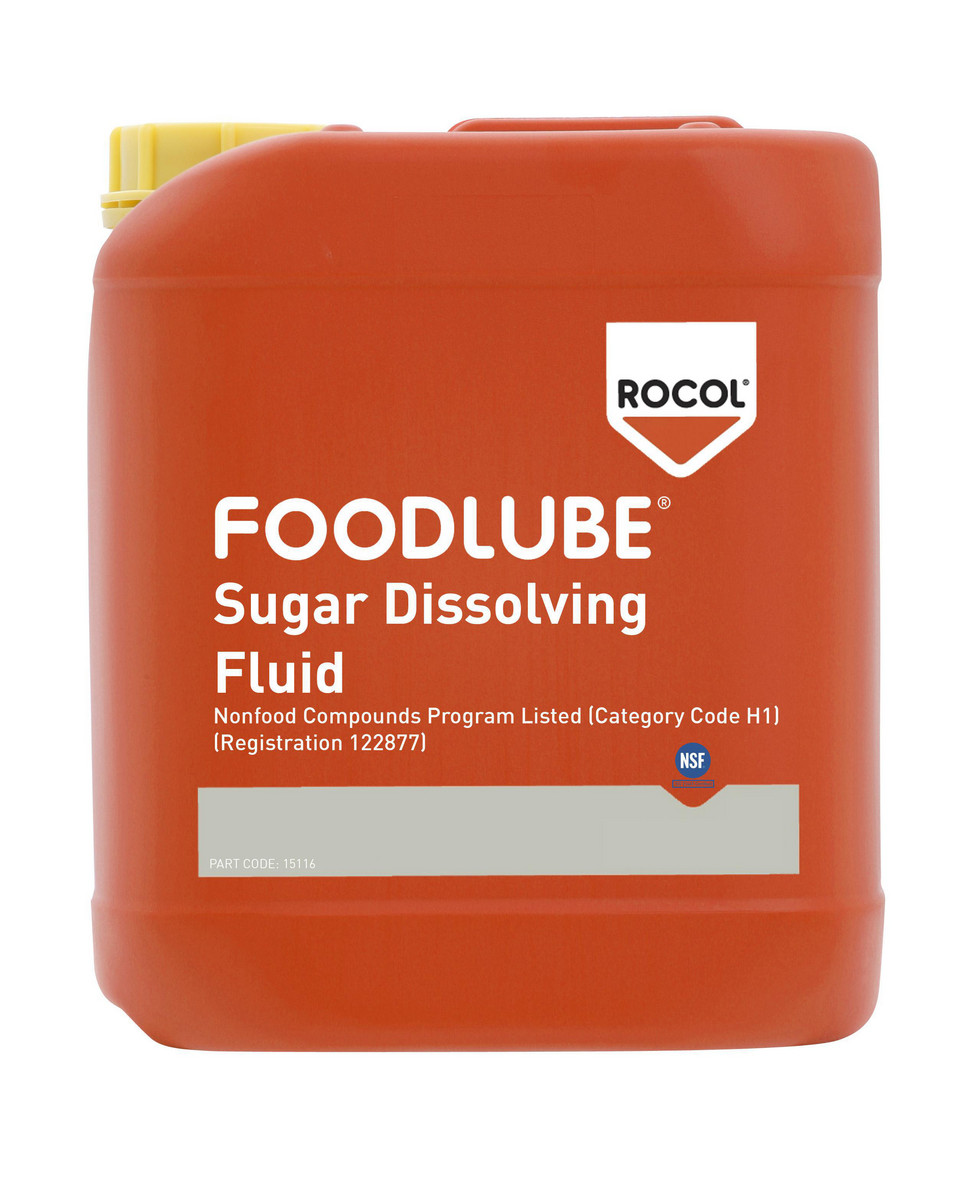 Rocol Foodlube Sugar Dissolving Fluid er en effektiv løsning til at opløse og fjerne sukker samt klæbrige sukkersubstanser fra alle overflader. Denne væske er specielt udviklet til at opløse og fjerne sukker og sukkersubstanser effektivt, samtidig med at den efterlader en let og bestandig smørefilm på overfladen. Produktet er fremstillet af FDA-kontrollerede ingredienser og opfylder den tidligere USDA kategori H1 specifikation. Det er fri for mineralske kulbrinter og indeholder hverken animalske eller genmodificerede ingredienser, hvilket gør det sikkert at anvende på steder, hvor utilsigtet kontakt med fødevarer kan forekomme.Egenskaber