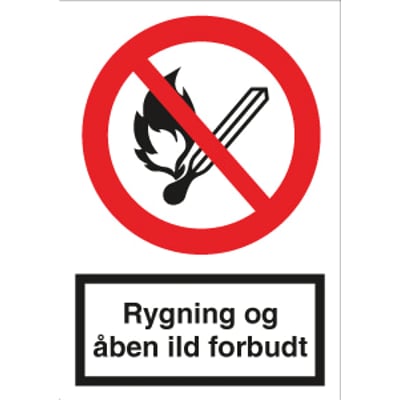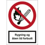 Forbudsskilt med teksten 'Rygning og åben ild forbudt'. Leveres i plast A4 format (297 x 210 mm). Overholder DS/EN ISO 7010:2011 standarden.