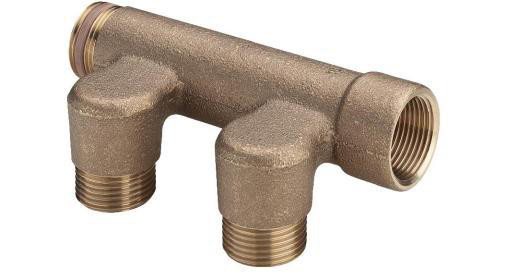 Viega fordelerrør i rødgods med G-gevind. Afgange til tilslutningsforskruninger med Viega indstik. Ikke godkendt til drikkevand.
