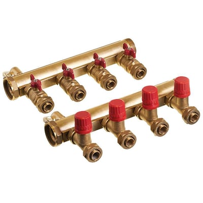 Fordeleren har monteret afspærringsventiler på afgreningerne på både frem- og returløb, og den leveres med fordelerkoblinger til 25 x 2,3 mm SnowFlex rør. SnowFlex fordelere tåler almindelige glykolblandinger.