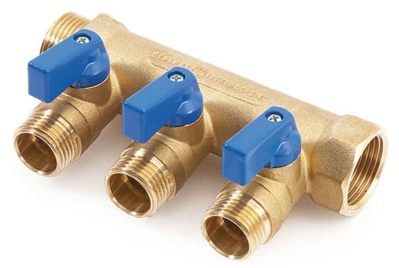 3/4" Fordelerrør med 2 afgreninger (1/2") i blå, med afspærring. Ideel til fjernvarme.