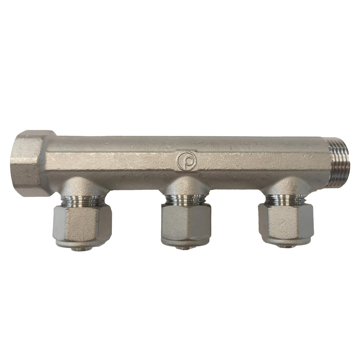 TEA belagt messing brugsvandsfordelerrør i ¾" med fast muffe & centerafstand 50 mm (CC50). Fordelerrør med 3 afgreninger til vand- og varmesystemer. Inkl. 15mm fittings.