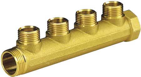 Fordelerrør fra Pettinaroli i messing med 4 afgreninger. Ideelt til vand- og varmesystemer.