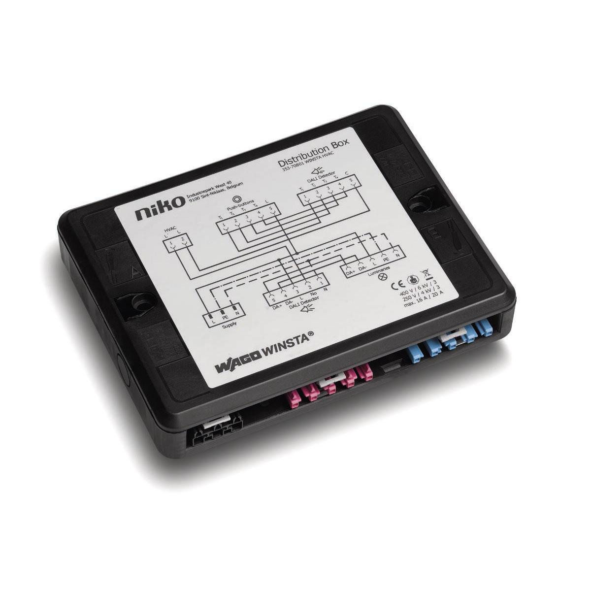 Denne fordelingsboks kan kombineres med (353-70801 HVAC, 353-70802 On/Off styring og 353-70803 standby minimering) og sikrer dermed højere sikkerhed ved fordeling af forsyningen til DALI armaturerne på 2 grupper.