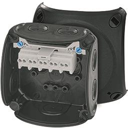 Hensel forgreningsdåse med klemme med 2 tilslutningsenheder pr. pol. 5-pol, pr. pol 8 x 0,75 mm² f, 6 x 1,5 mm² r / f, 4 x 2,5 mm² r / f, 2 x 4 mm² r / f. Med integrerede elastiske membraner.
