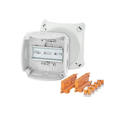 Forgreningsdåse med fjederklemmer og kabelindgang via gummimembraner. Leveres med montagebeslag og 3-leder fjederklemmer. Farve: grå (RAL 7035).