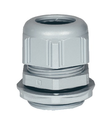 Plastforskruning med møtrik PG29, IP68, RAL7001. Møtrik medfølger.