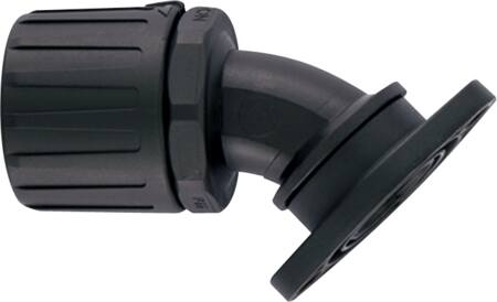 IP66 forskruning med 45° vinkeltilslutning og flange. Hurtig montage og optimal fastholdelse. Modstandsdygtig over for opløsningsmidler og olier. Halogenfri.