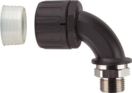 IP68 forskruning med 90° vinkeltilslutning og udvendigt gevind. Hurtig montage, optimal fastholdelse og modstandsdygtig overfor opløsningsmidler og olier. Halogenfri.