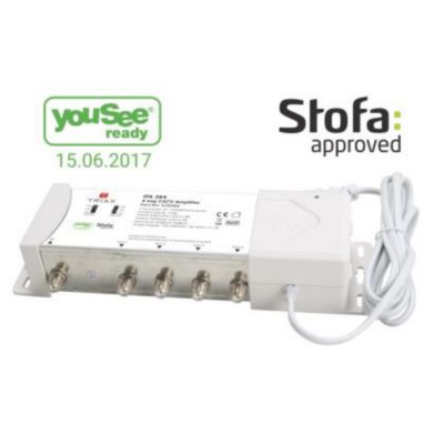 Triax IFA 384 forstærker med 4 udgange, 85-1006MHz og 0-12dB. Trin: 0/6/12 eq. Godkendt til YouSee og Stofa. Ideel til MATV/SMATV løsninger.