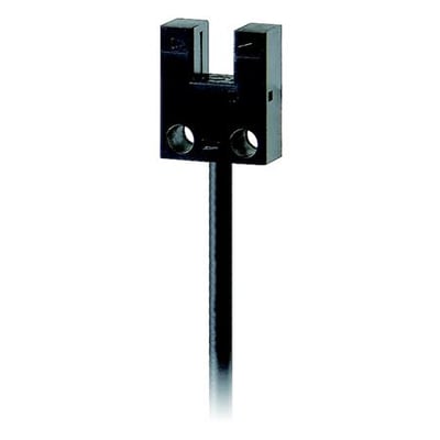 Fotomikrosensor af slottype med PNP-udgang og 1 meter robotkabel, ideel til præcis objektdetektering.