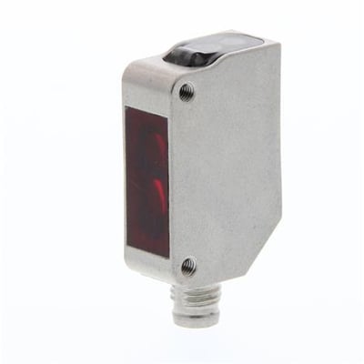 Denne fotocellesensor er designet med et robust, rektangulært hus i rustfrit stål og anvender rød LED-teknologi.