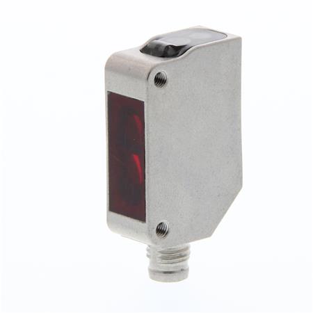 Fotocellesensor med rektangulært hus i rustfrit stål, rød LED, baggrundsafblænding, 100 mm, PNP, Light-ON/Dark-ON og M8 4-polet stik.