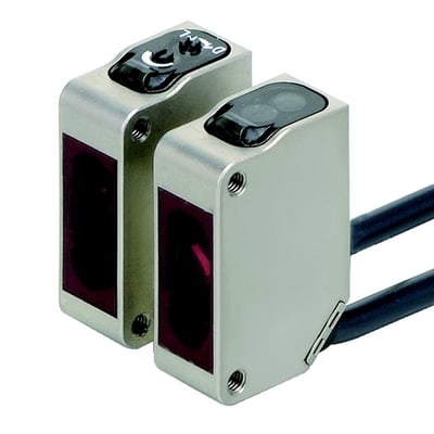 Fotocellesensor med rektangulært hus i rustfrit stål og infrarød LED. Gennemgående stråle, 800 mm, PNP, Light-ON/Dark-ON, med 5 meter kabel.
