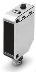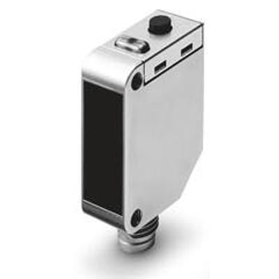 Denne fotocellesensor fra Omron er designet til pålidelig detektion af transparente objekter, såsom PET-flasker. Sensoren er udført i et robust, rektangulært hus af rustfrit stål, hvilket sikrer holdbarhed og modstandsdygtighed i krævende miljøer. En rød LED indikerer driftsstatus.