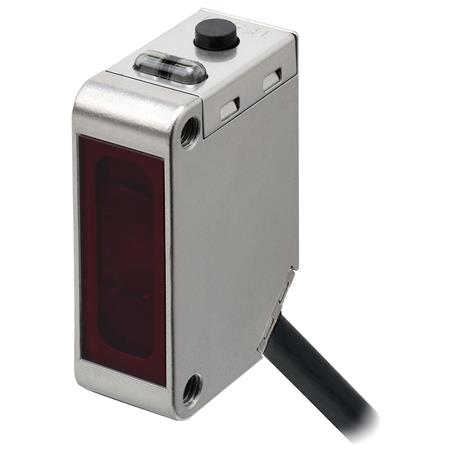 Fotoelektrisk sensor med rektangulært hus i rustfrit stål og rød LED. Refleksiv, transparent objekt, 500 mm, med oplæringsknap, PNP, Light-ON/Dark-ON, 2 m kabel.