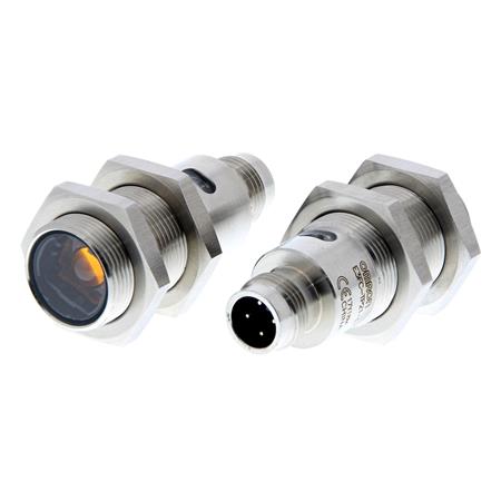 Fotoelektrisk sensor med M18 gevind, rustfrit stål, rød LED, gennemgående bjælke, 20 m, PNP, Light-ON/Dark-ON, M12 stik.