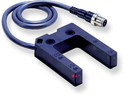 Fotoelektrisk sensor med slothus og infrarød LED. Enkelt entréstråle, 25 mm, NPN, Light-ON/Dark-ON, M8 pigtail-stik 4-polet, 0,3 meter.