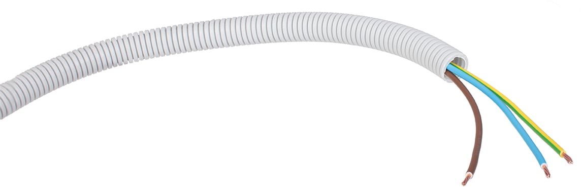 Fleksibelt rør med 7G1,5 ledning. Jordforbindelse inkluderet. Ledermateriale: kobber.