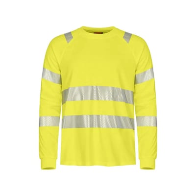 Metalfri, flammehæmmende Hi-vis T-shirt med lange ærmer og 20% genanvendt bomuld. PFAS-fri. Rund hals og påvarmede reflekser for ekstra komfort.