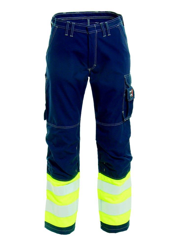 Flammehæmmende Hi-Vis arbejdsbuks i let, behagelig og slidstærk kvalitet. Med sidelommer, baglommer med klap, cargo lomme med klap, skjult D-ring og justerbare knæpudelommer.