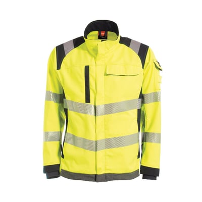 Metalfri, vind- og vandafvisende, flammehæmmende Hi-Vis softshell jakke med høj komfort. Jakken har høj Arc Rating og er ergonomisk designet til arbejde med løftede arme.