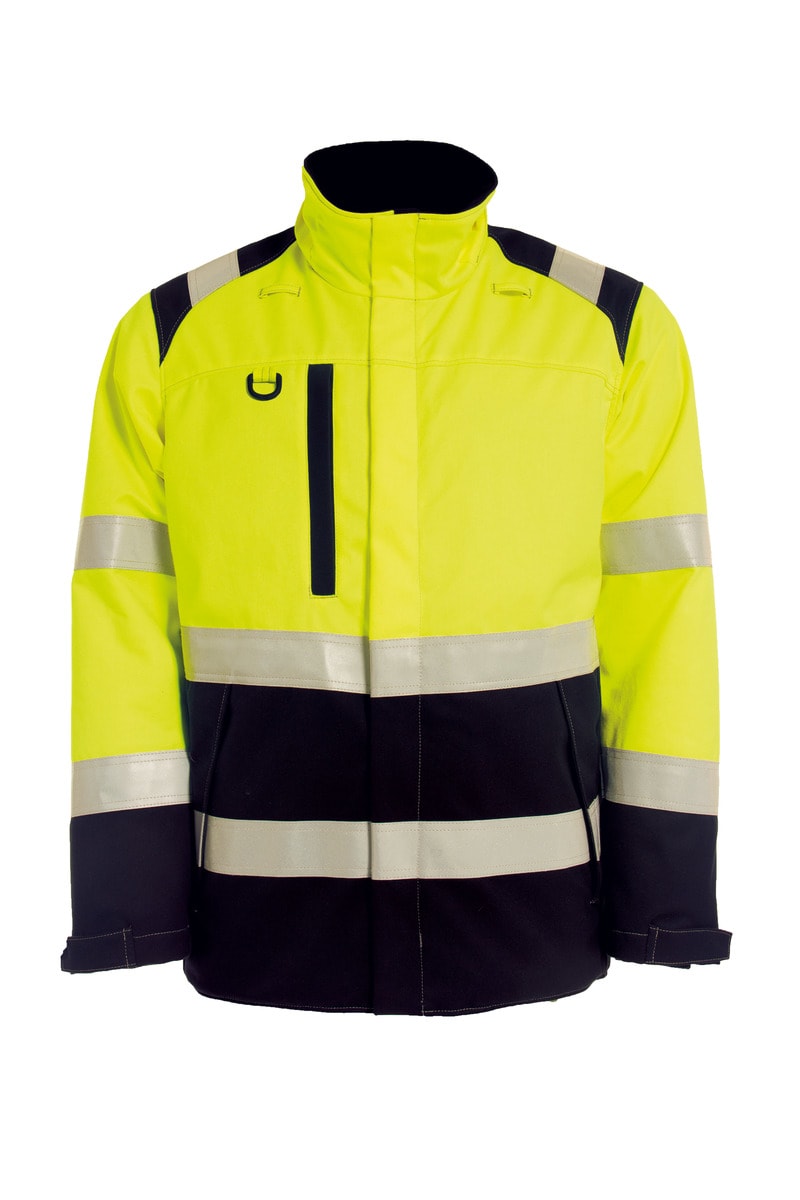 Metalfri, flammehæmmende Hi-Vis vinterjakke med tapede sømme og quiltfoer. Vind- og vandtæt iht. EN 343.