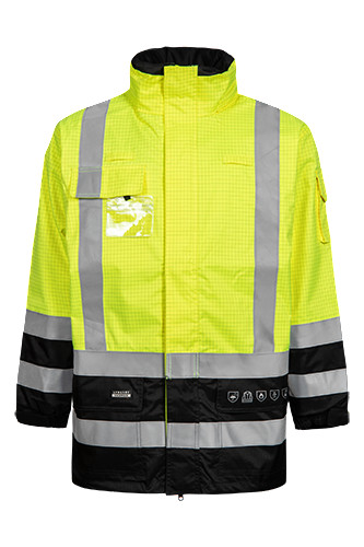HiViz vinterregnjakke i kraftig brandhæmmende og rivfast kvalitet. Materiale: 98% Polyester, 2% Carbon Grid, 240 g/m2. Foer: 100% Bomuld.