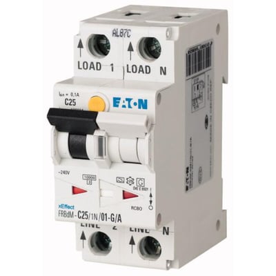 Kombirelæ FRBDM-C20/1N/003-G/A fra Eaton. 20 A, 30 mA, MCB karakteristik: C, 1p+N, RCD karakteristik: A.