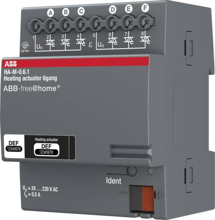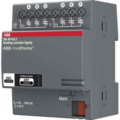 ABB-free@home aktuator til varmestyring af motorventiler/telestater (24V eller 230V). Kan håndtere op til 6 kredse og monteres på DIN-skinne.