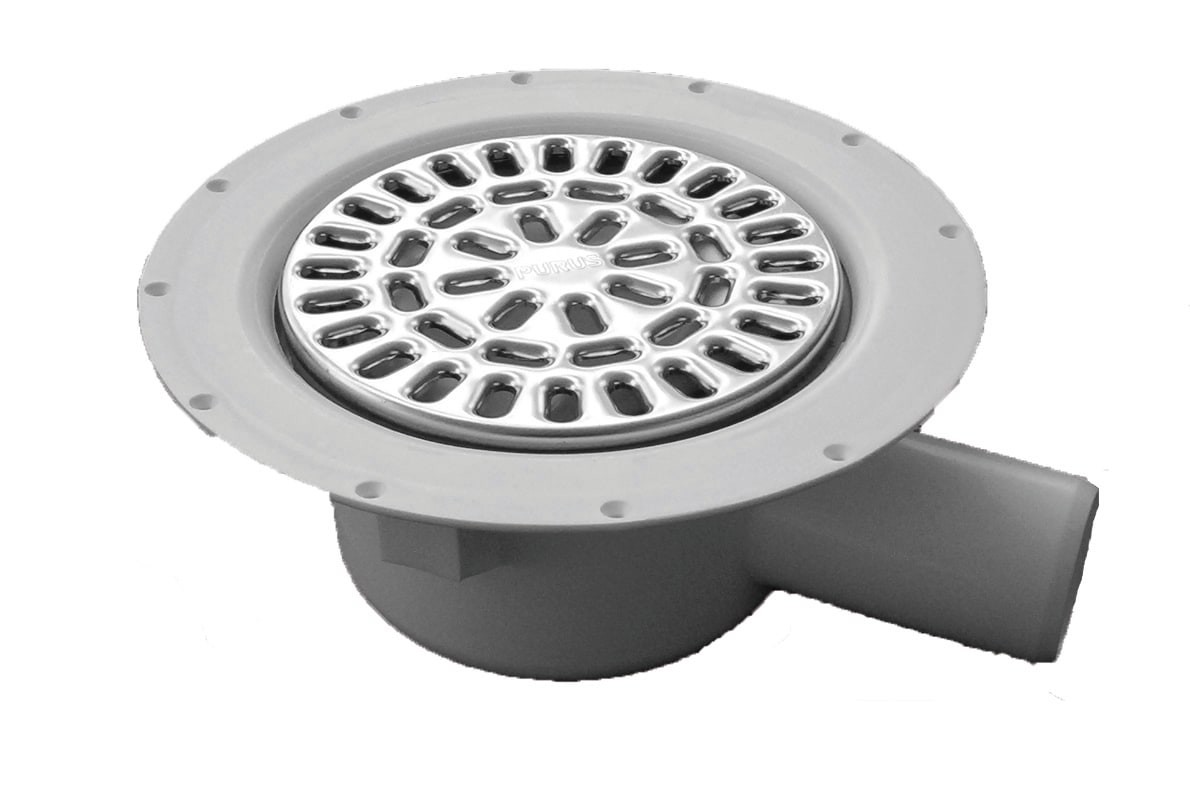 Purus Freja gulvafløb i PEH til svejsning, med vandret udløb og indbygget vandlås. Leveres med en ø150 mm rist i rustfrit stål. Ideel til beton- og trægulve med vinylbelægning.