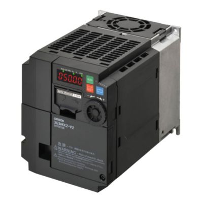 MX2-EV2 inverterdrev fra Omron, med en effekt på 1.5/2.2 kW og strøm på 4.8/5.4 A. Til 400 VAC, 3-faset indgang og med sensorløs vektorkontrol. Maksimal udgangsfrekvens på 590 Hz.