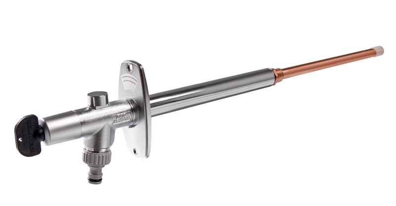 Frosti udendørshane med aftageligt greb. Byggemål 150-492 mm. Universel tilslutning R 1/2" eller Cu-rør 15 mm.