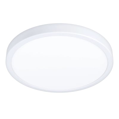 EGLO Fueva 5 LED plafond i hvid stål, med en diameter på 285 mm. Den leverer 2400 lumen ved 3000K og har en IP44-klassifikation.