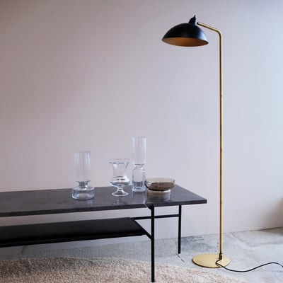Futura gulvlampen fra Dyberg Larsen kombinerer et futuristisk udtryk med et moderne design. Sort farve kombineret med antik messing look. Lampeskærmen kan vippes og drejes.
