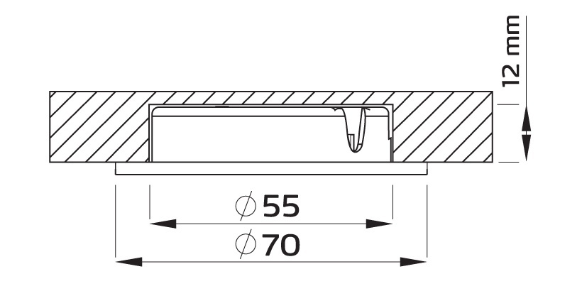 Indbygning: Ved indbygning kræves et hul på 55 mm i diameter og kun 12 mm i dybden. Spottet er forsynet med 4 fjeder-clips, der fungerer som modhager. Spottet trykkes blot op i hullet, og de 4 clips vil holde det på plads.